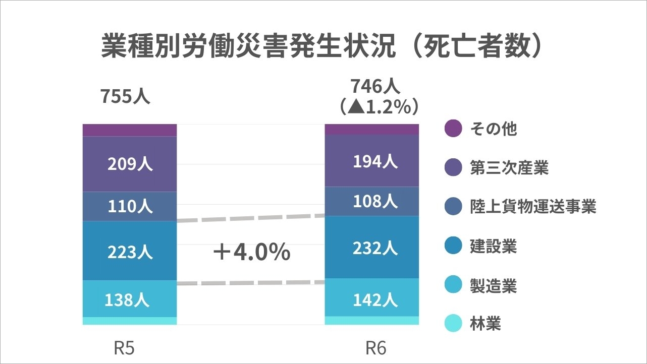 日本の全産業のなかで、建設業は労働災害による死亡者数が最も多いです。厚生労働省の発表によると、令和6年の建設業における死亡者数は232人で、前年と比較して9人(4.0%)増加しています。